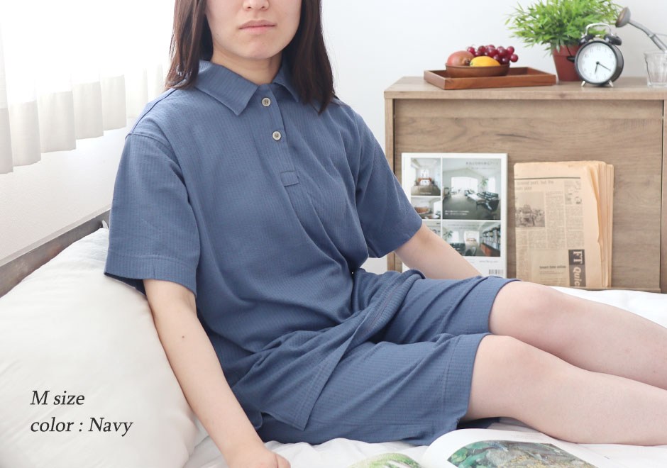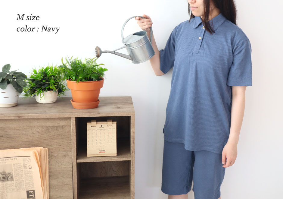 襟があるとパジャマ感も少なく、ちょっとした外出でも気にならないおしゃれなポロカラーのデザイン。ポロシャツ好きな方に、24時間着用いただける眠れるポロシャツパジャマです。1枚でもきちんと感がでますので、ルームウェアにも最適です。