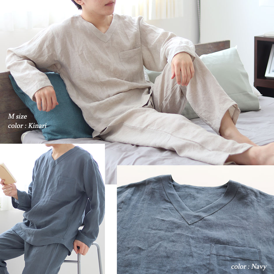 洗い加工のフランスリネンで優雅な夏を やわらかるいリネンメンズパジャマ上着単品・長袖/かぶり/Vネック 【オーダーメイド】