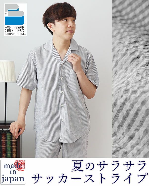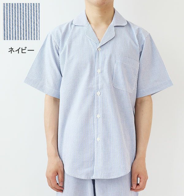 ポコポコ感でベタつかない!涼しい爽やかな夏 先染めサッカーストライプメンズパジャマ上下セット・半袖/前開き/短パン/開襟 【オーダーメイド】