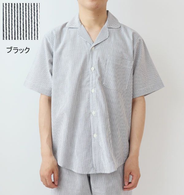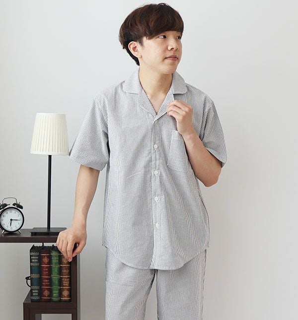 見た目も爽やかな先染めストライプのメンズパジャマ半袖短パンデザインの登場です!おしゃれな開襟デザインでルームウェアとしても大活躍!素材には綿100のサッカー地でべたつかず柔らかな肌触りをお楽しみいただけます!