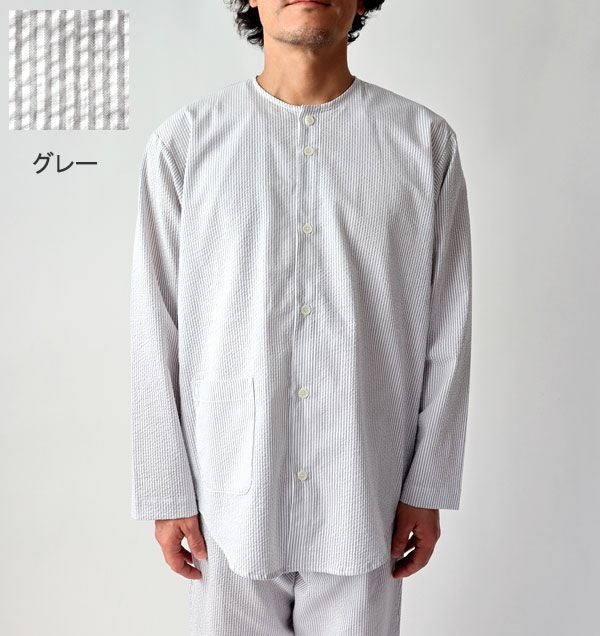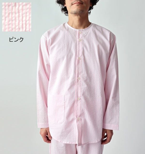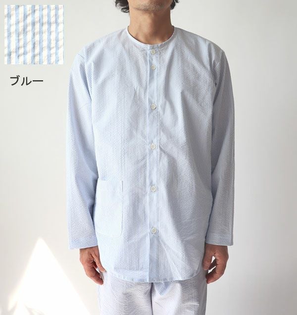 ポコポコ感でベタつかない夏のサッカーパジャマの上着単品。メンズXS~5L。首元すっきりの襟無タイプ。綿100%、先染めの産地、播州織の爽やかなストライプと柔らかな肌触りで夏のパジャマに最適です。長袖なので、クーラーの部屋でお休みの方におすすめです。
