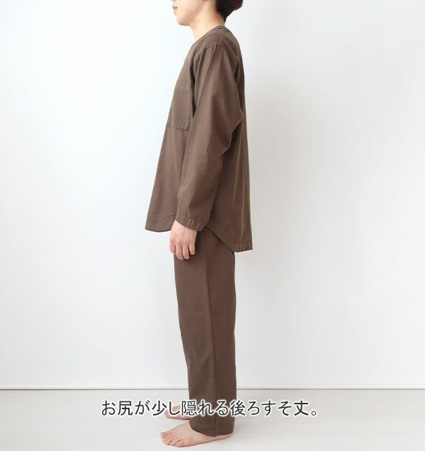 パジャマ感が少なくおしゃれなヘンリーネックデザイン。襟なしのかぶりタイプで着脱しやすく、ボタンは一つ開けてもだらしなくならないから、首周りをすっきりさせたい方にもおすすめです。