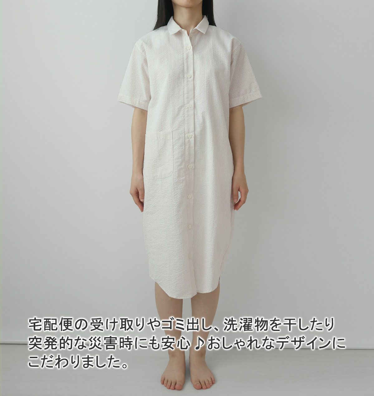 柔らかくべたつかない肌触りが心地良いニットサッカーからレディースの半袖ワンピースの登場です!前開きシャツタイプでレギンスと合わせれば急な配達にも対応できる嬉しいデザインです!