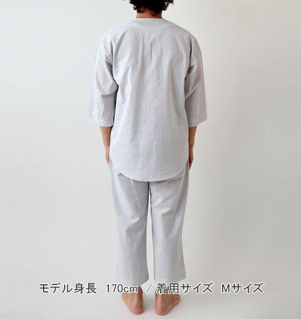爽やかなポコポコ感!ベタつかない夏のサッカー地 先染めサッカーストライプメンズパジャマ 上下セット・七分袖/前開き/襟なし 【オーダーメイド】