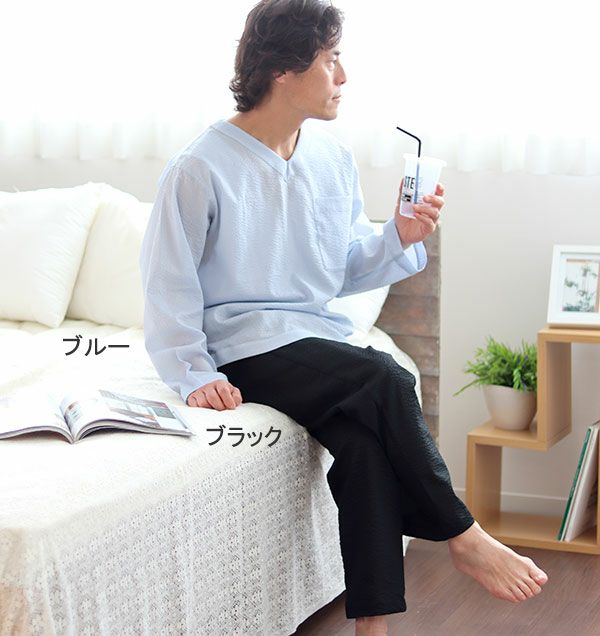 ふわっと軽やか、ベタつかない。涼しく冷やさず爽快な夏 エアリーリップルメンズパジャマ 上下セット・長袖/かぶり/Vネック 【オーダーメイド】
