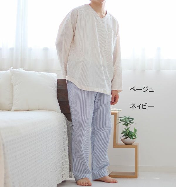 ポコポコ感でベタつかない!涼しく冷やさず快適な夏 先染めサッカーストライプメンズパジャマ 上下セット・長袖/かぶり/Vネック 【オーダーメイド】