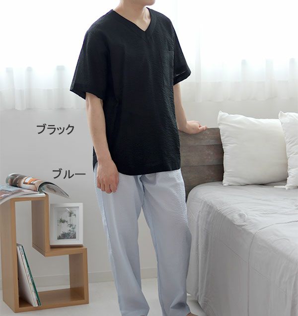 ポコポコした生地表面ではりつかず柔らかな風合いが心地よい天竺ニットサッカーのメンズパジャマです!おしゃれなVネックデザインで夏のルームウェアにも最適です。安全の日本製でセミオーダーメイド対応です!