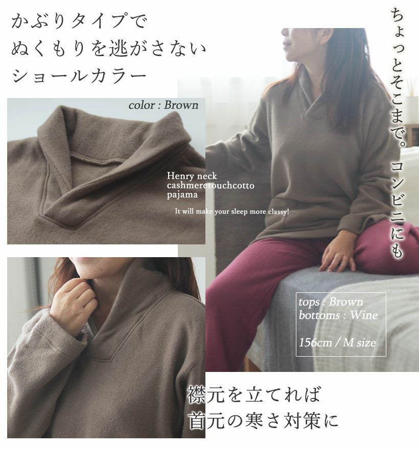 かぶりタイプで着脱しやすいショールカラーパジャマ。折っても立てても使えるヘチマ襟は、寒さや気分によって使い分けていただけます。パジャマ感が少ないので、ズボンだけ替えてちょっとした外出にも!カシミヤタッチコットショールカラーパジャマは部屋着・ルームウェアにもおすすめです。