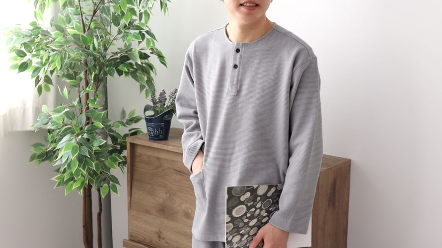 かぶりタイプのヘンリーネックパジャマはTシャツ感覚で着られてラクチンなのに、こなれ感があってだらしなく見えず部屋着・ルームウェアにぴったり!ワッフル編みで仕上げた凹凸のある生地がおしゃれな印象に!綿100%のニットはやわらかくて伸縮性があるので、一日中着ていたくなります。シワになりにくく、ちょっとした外出や旅先へ持っていくパジャマとしてもおすすめです!