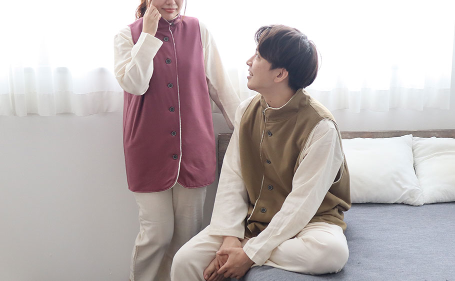 パジャマやルームウェアの上から着られる。締め付け感がなく、体を動かしやすい無理のないゆったりしたデザインです。