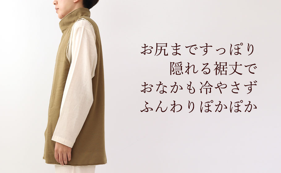 冬場は特に冷えやすいおなか。冷えないようしっかり防寒しつつも家事などがしやすいよう、動きやすい着丈にこだわりました。
