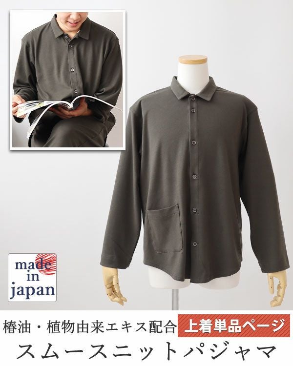 オーガニックコットンスムースニットメンズパジャマ上着単品・長袖/前開き/襟あり