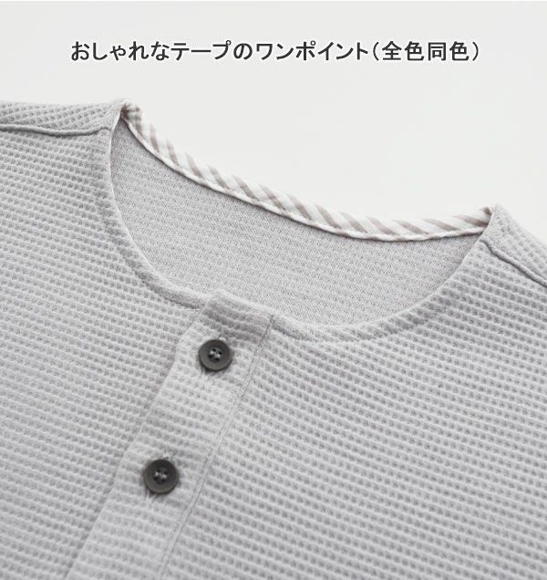 パジャマ感が少なくおしゃれなヘンリーネックデザイン。襟なしのかぶりタイプで着脱しやすく、ボタンは一つ開けてもだらしなくならないから、首周りをすっきりさせたい方にもおすすめです。就寝時はもちろん、部屋着・ルームウェアにもぴったり!
