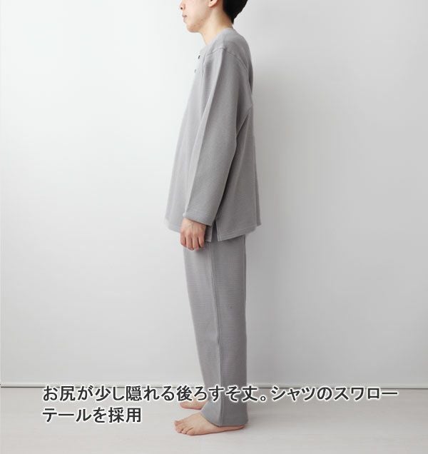 コットンワッフルニットメンズパジャマ上下セット・長袖/かぶり/襟なし
