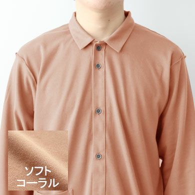 | 仕様 | 長袖 オーバーロック外側(肌のデリケートな方向け縫製仕様) 前開き 襟あり スモールカラー 右下ポケット |