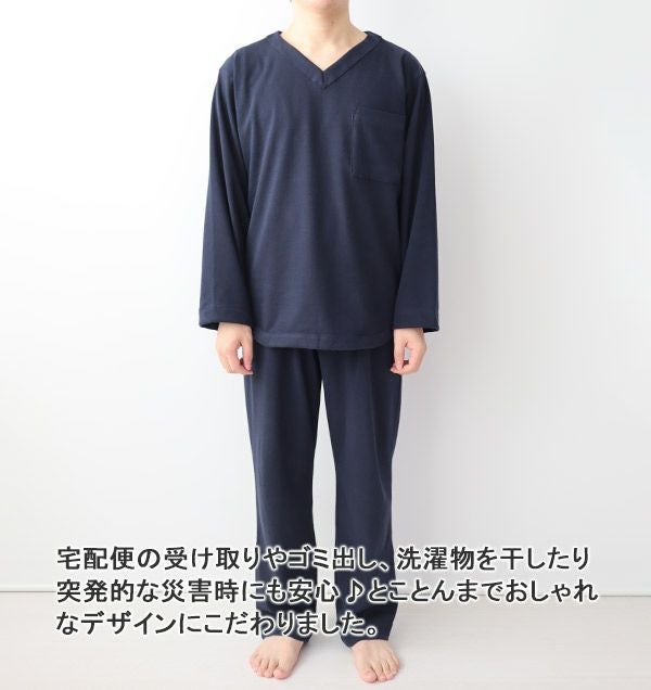 ふわふわ裏起毛スウェットのVネックパジャマルームウェア。メンズXS~5L。真冬でも朝までぽっかぽかのフリースに負けない暖かさに関わらず、綿100%なのでムレずに快適にお過ごしいただけます。袖丈・ズボン丈の長さも調整可能。