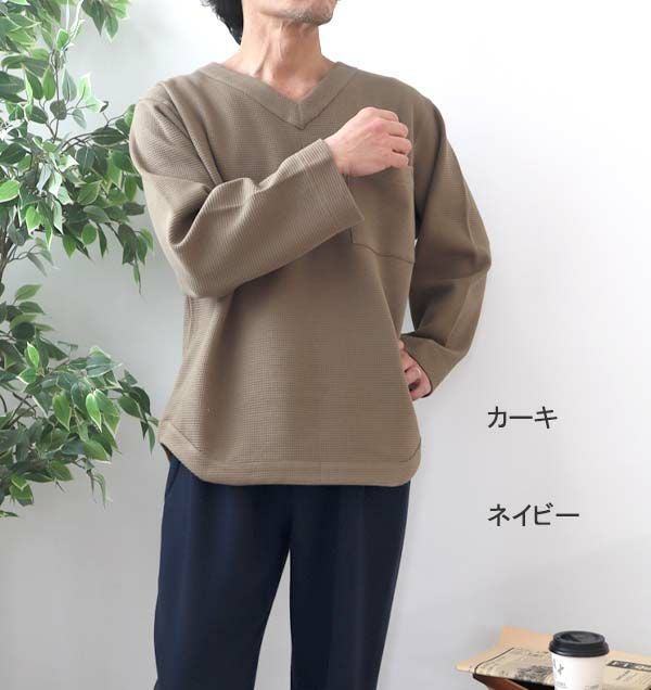 コットンワッフルニットメンズパジャマのご紹介!普段着みたいにおしゃれでルームウェアにもおすすめです!Vネックデザインはかぶりタイプで脱ぎ着がラクチンなのにスッキリ見え!しわになりにくくお肌に優しいワッフル生地!