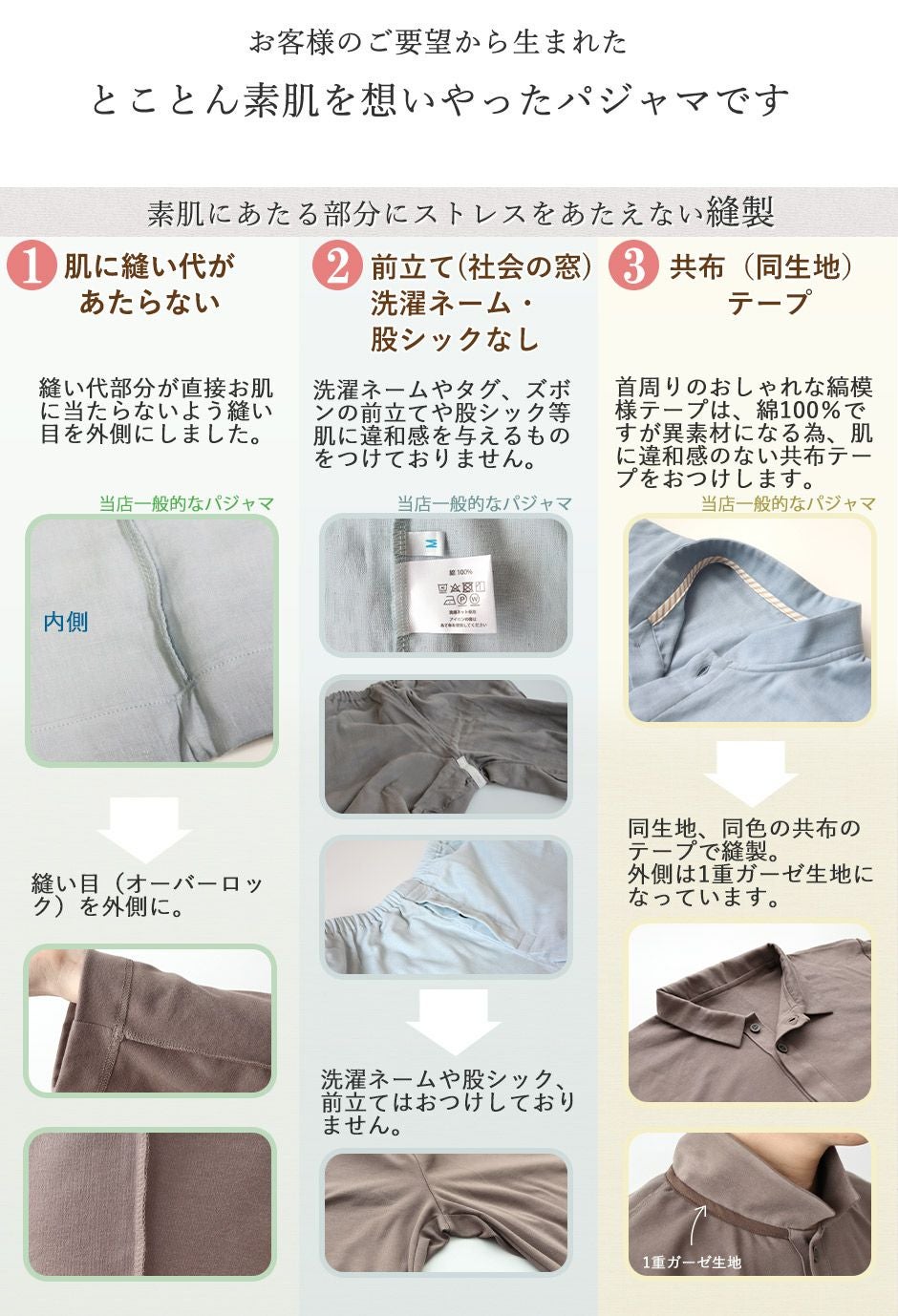 縫い目が外側で肌に当たらない仕様 3重ガーゼメンズ敏感肌パジャマ上下セット・長袖/前開き/襟あり 【オーダーメイド】