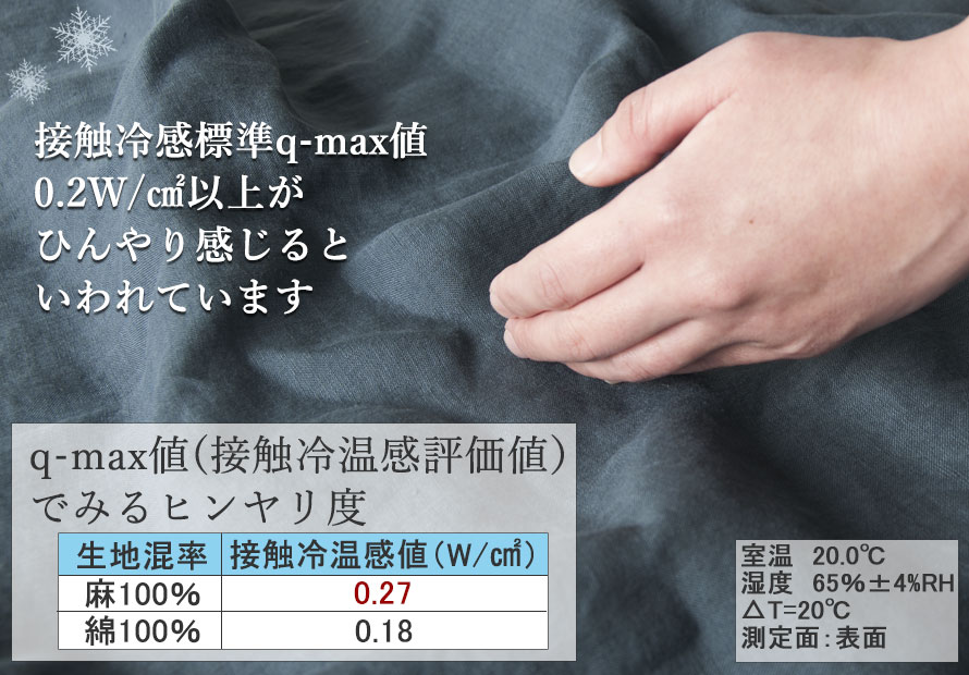 - 接触冷感、天然繊維で一番冷たい、麻100%