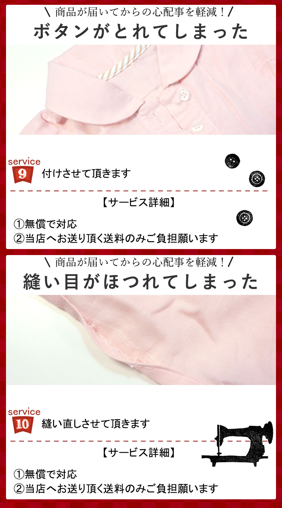つくるパジャマでは、売りっぱなしには致しません!ご購入後2年間、お客様のご要望に応じて、修理サポートをさせて頂いております。受注後、2年以内に以下内容で修理や調整が必要な場合は、該当商品を当店にお送り頂く前後にこちらのページよりご注文をお願い致します。