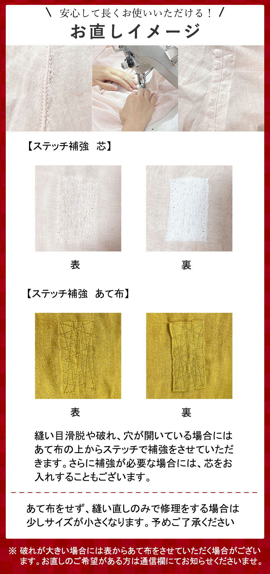 ※ 破れが大きい場合には表からあて布をさせていただく場合がございます。お直しのご希望がある方は通信欄にてお知らせくださいませ。
