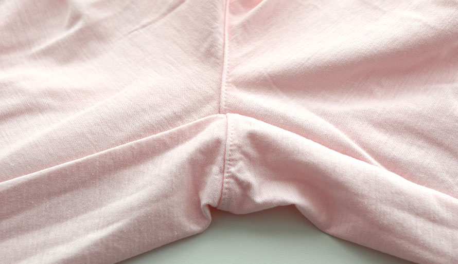 糸が細いほど生地は柔らかくなります。天竺ニットは太い15番手糸から細くても30番手糸が多いですが、かなり細い40番手糸を使用することで、ふんわり滑らかなほおずりしたくなるような柔らかさです。その柔らかさゆえに裁断、縫製泣かせといわれるほど。高級ブランドのTシャツにも使われる生地を贅沢にもパジャマにしました。