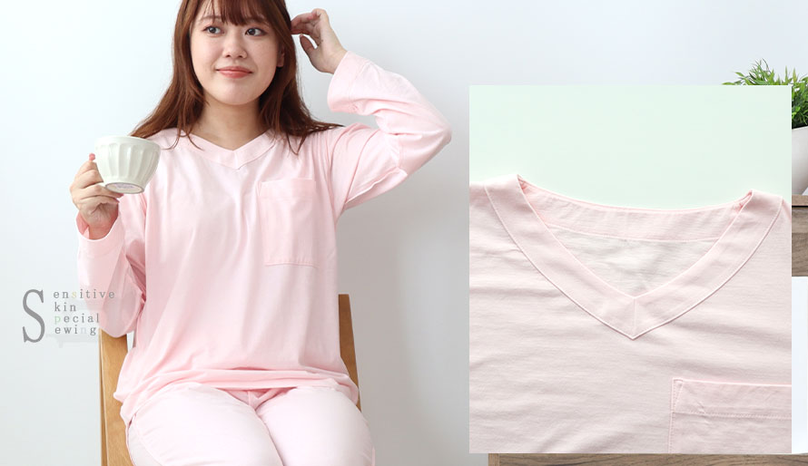 襟ありパジャマの場合、首元に襟が当たって気になったりすることも。Vネックデザインを採用し首周りをより開放的にすることで、リラックス感はそのままにお肌への負担を軽減しました。また、ニットなので伸縮性もあってかぶりタイプだから着脱も楽々♪