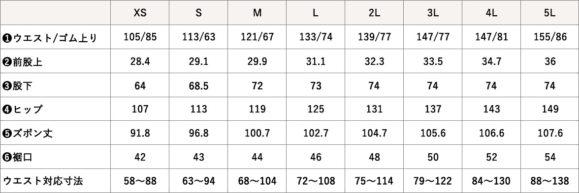 ズボンサイズ表のウェスト対応寸法やヒップのサイズから基本のサイズを選び、ウェストゴム上りをご覧下さい。