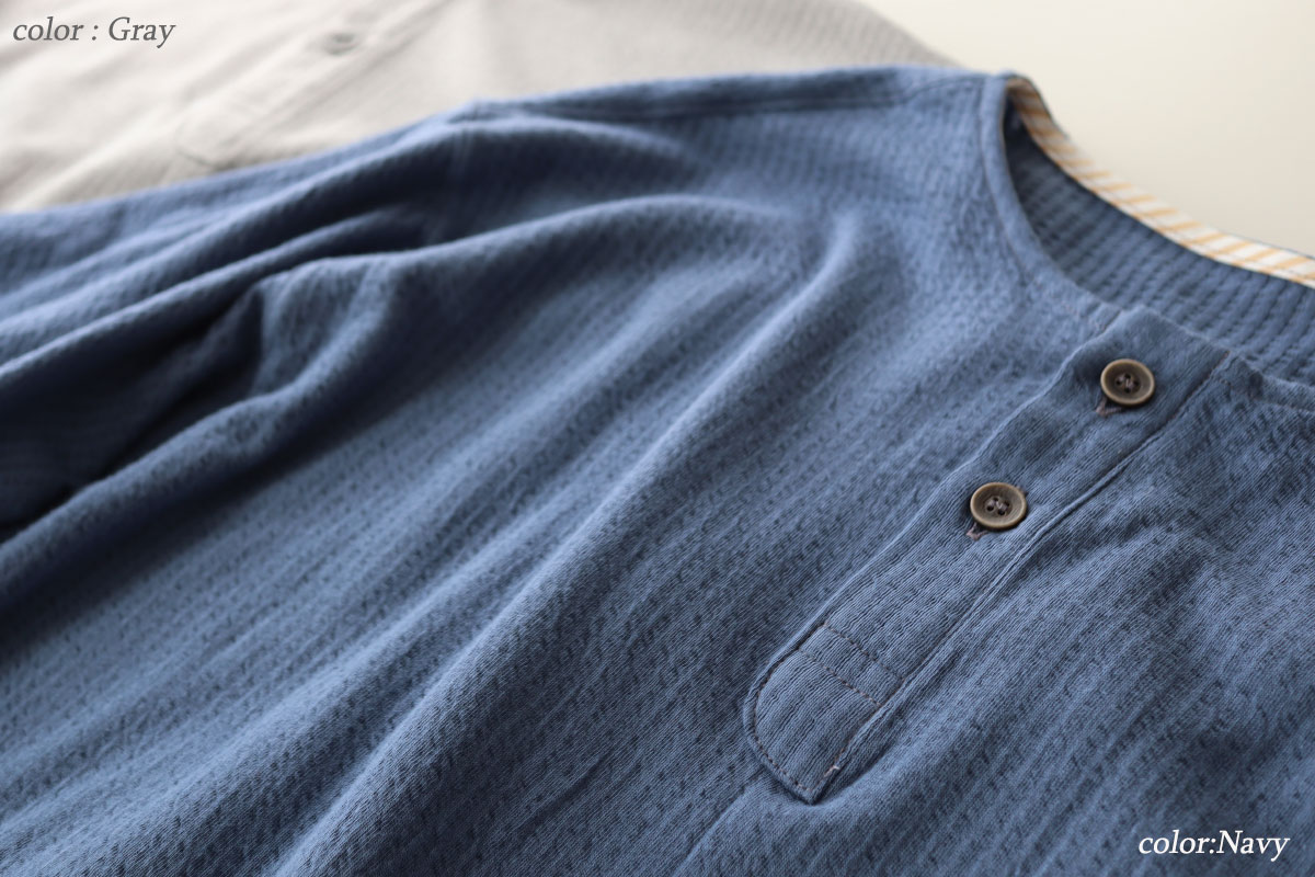 まるでシャツのようなニットサッカーは、ズボンだけ、かえればゴミ出しはもちろん外出にも着ていけそうです!涼しい夏のおしゃれなルームウェアとしても。Tシャツとは違う1枚で大人っぽくおしゃれ印象になれるヘンリーネックデザイン。ボタンをはずしただけで全く違う印象に・・・かぶりのヘンリーネックのデザインは夏の1番人気の形です。