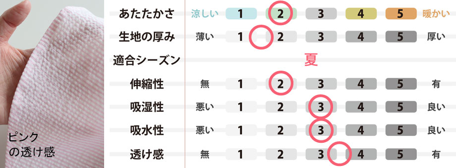 経糸に収縮率の違う糸を 何本かおきに配列して織ることでポコポコとうねった表情になります。肌に触れる面積が小さくはりつかないので、いつもさらさら、大変涼しく感じます。強撚糸などを用いたサッカー生地に比べ、シャリ感は少なく、ゴワゴワしすぎないのが魅力です。汗をよくかく方、さらさらした感触がお好きな方に。春から夏にかけておすすめです。