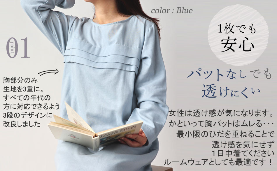 ふわふわ柔らかダブルガーゼレディースワンピース・長袖/かぶり/ラウンドネック
