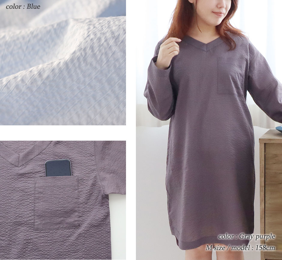 ふんわりとやわらかく、ごわごわしないエアリーリップル。Vネックデザインのかぶりワンピースでおうち時間にゆったりくつろぎを。ルームウェアにも最適!