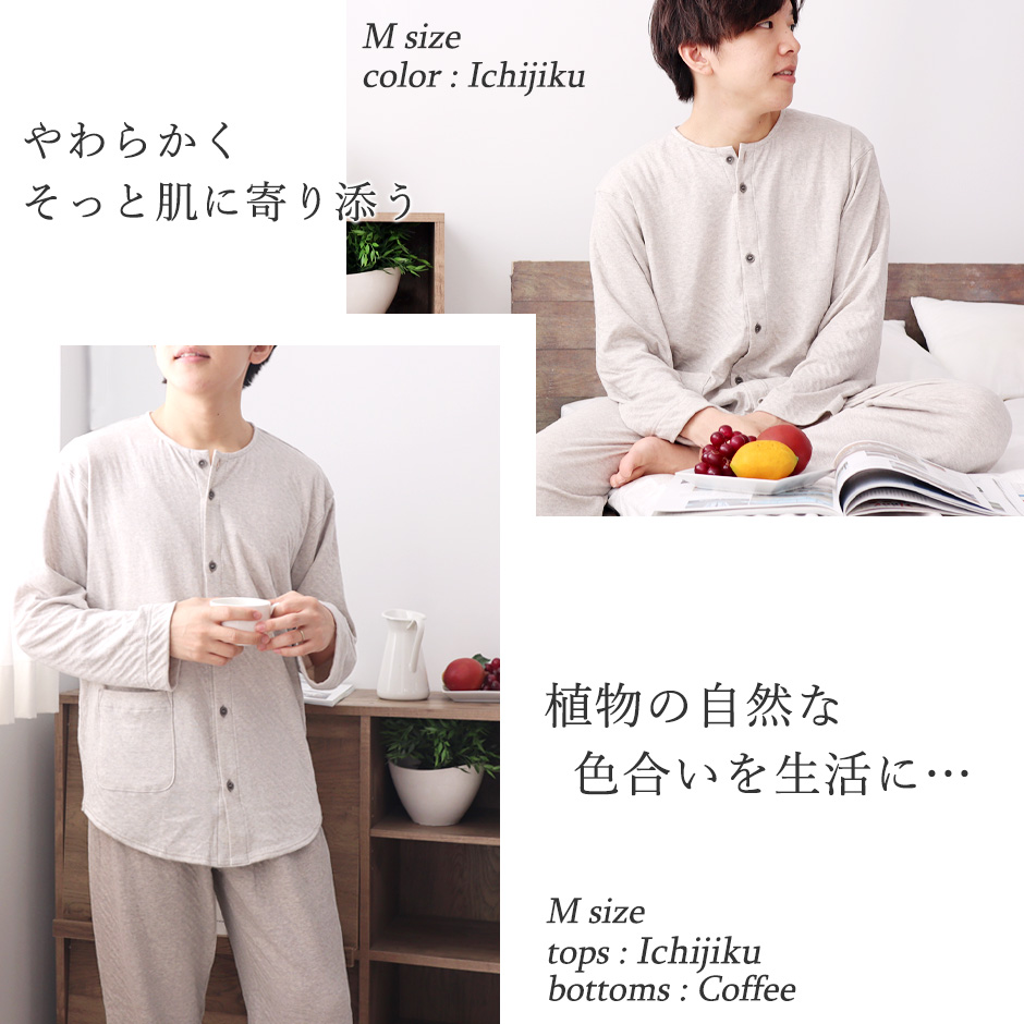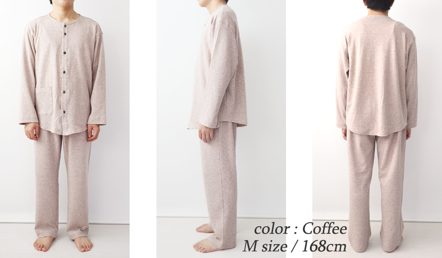 スフレニットメンズパジャマ上下セット・長袖/前開き/襟なし
