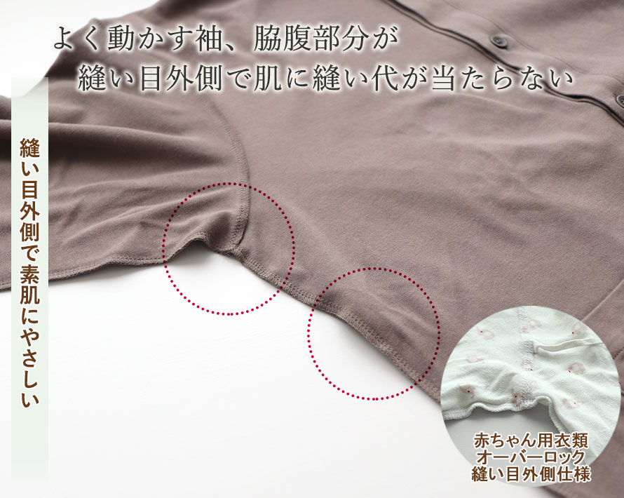 | 仕様 | 長袖 オーバーロック外側(肌のデリケートな方向け縫製仕様) 前開き 襟あり スモールカラー 右下ポケット |