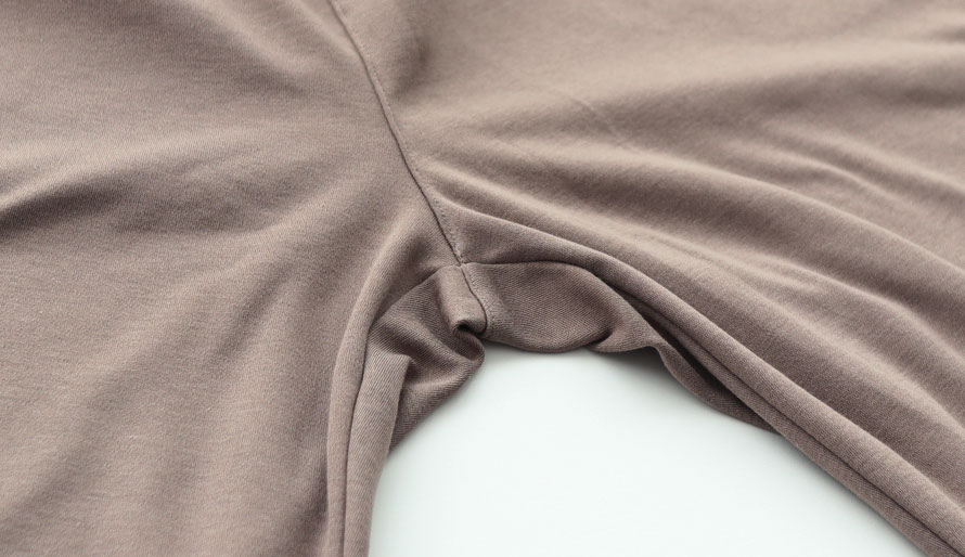 和歌山の編み職人と愛知の染め職人に依頼した、特別なスムースニットの秘密は糸と風合い加工にあります。30番手糸などが使われることも多い、スムースニットをさらに細番手の40番手のコーマ糸を使うことで、特別柔らかくなり、さらに染め工程の仕上げでふっくらにする風合い加工をすることで、まるで「ムースのような肌触り」の由来ともいえる、たっぷり空気を含んだ、もっちりなめらかな冬のニットパジャマが出来上がりました。