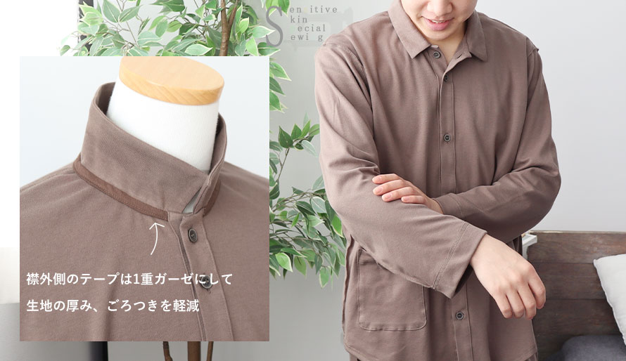 つくるパジャマの首周りは縞模様の綿100%テープを使用していますが、それでも同じ生地でないと気になられる方もいらっしゃいます。そこでこのパジャマでは同じ生地、同じ色の共布を使用しています。また、襟外側のテープは1重ガーゼ生地にすることで襟元の生地の厚みやごろつきを軽減。さらに始末を外側にすることでお肌に触れる面の凹凸を少なくして違和感を軽減しました。