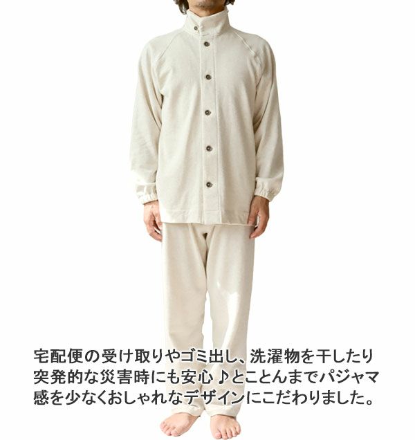 他の画像を見る 冬のあったか裏起毛スウェット 裏起毛スウェットメンズパジャマ 上下セット・長袖/前開き/襟なし 【オーダーメイド】 冬 綿 ニット 【税込価格】 ¥ 20,020 税込 裏起毛がふわふわ心地よい暖かいメンズパジャマです。前開きタイプだから着脱がしやすく、スウェット生地ならではの伸縮性で寝返りもしやすいので、介護用にもおすすめです。綿100%で蒸れにくく快適にお過ごしいただけます。 5.00 (1) 詳細を見る お気に入りに登録する