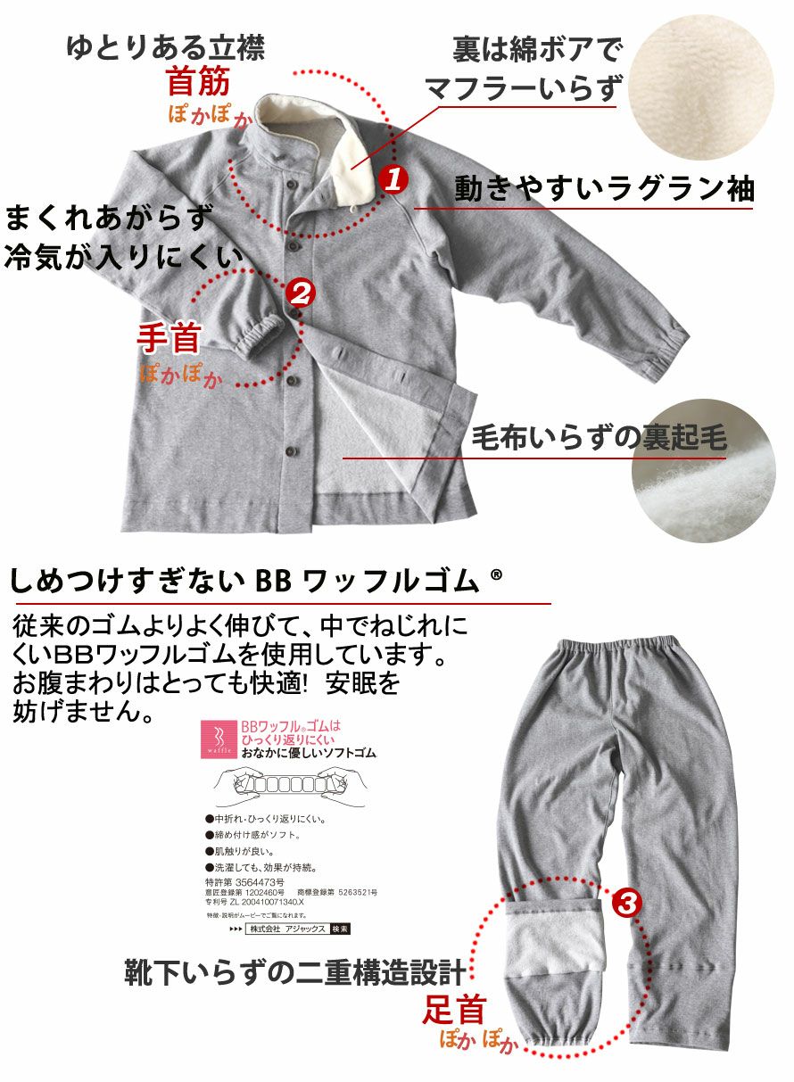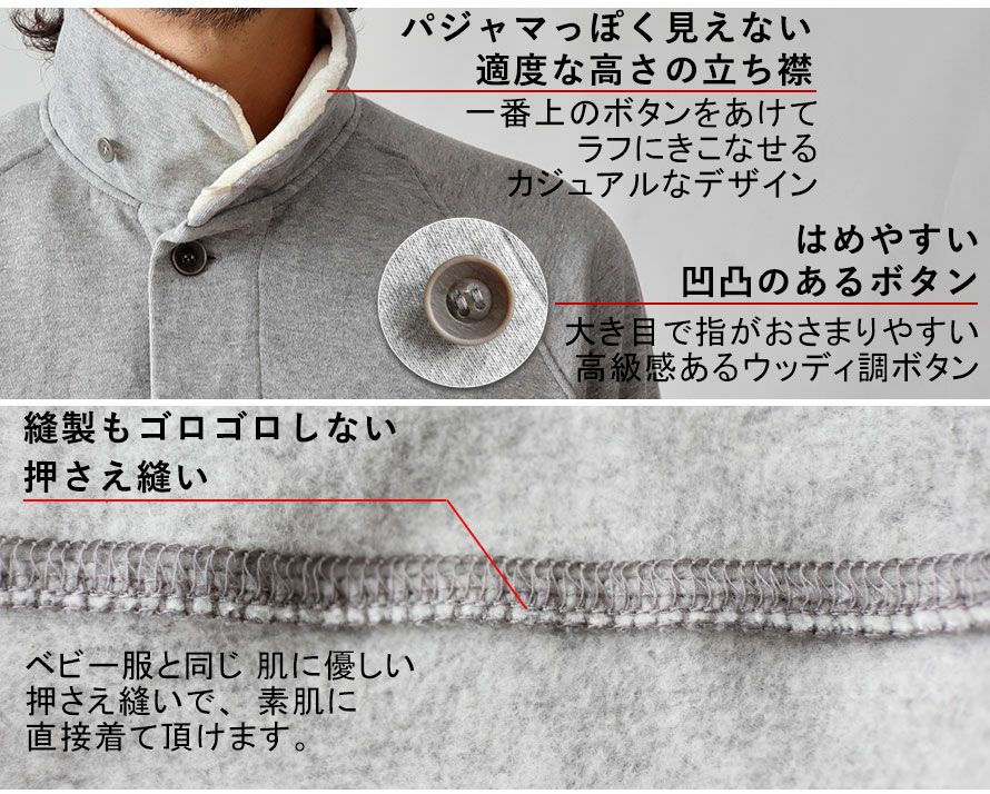 他の画像を見る 【改良版】 3大首を冷やさず即入眠!裏起毛スウェットで超あったか 【翌営業日出荷】ヒートネックコットンメンズパジャマ 上下セット・長袖/前開き/立ち襟 【グレー/Mサイズ】 冬 綿 ニット 【税込価格】 ¥ 21,340 税込 ふわふわした肌触りが気持ち良い大人気の裏起毛スウェットのメンズパジャマです。今までフリースを使われた方にもおすすめの蒸れにくい綿100%素材で、首元、手首、足元が暖かい仕様だから朝まで快適にお過ごしいただけます。 (0) カートに入れる お気に入りに登録する
