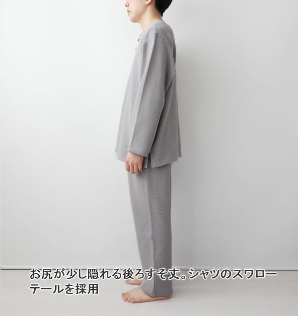 他の画像を見る シワになりにくい!おしゃれなワッフルニット コットンワッフルニットメンズパジャマ上着単品・長袖/かぶり/襟なし 【オーダーメイド】 秋 冬 綿 ニット 【税込価格】 ¥ 11,440 税込 編み目がぽこぽこと表情のあるコットンワッフルニットのメンズヘンリーネックパジャマ上着単品です。かぶりタイプで着脱しやすく、急な来客にも対応できるのが嬉しい♪どんなボトムスにも合わせやすいシンプルなデザインで、一枚持っておきたいアイテムです! (0) 詳細を見る お気に入りに登録する