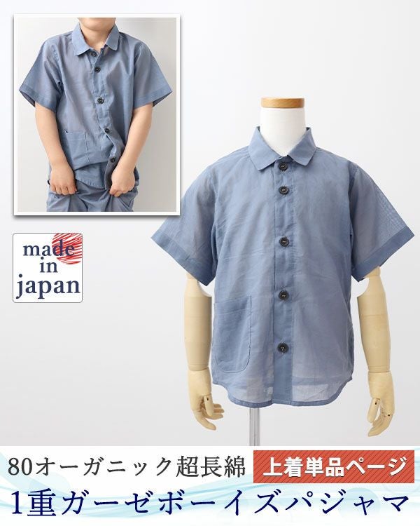 新感覚ガーゼ!柔らかいのにサラサラの肌触り 80オーガニック超長綿1重ガーゼ男の子パジャマ上着単品・半袖/前開き/襟あり 【オーダーメイド】